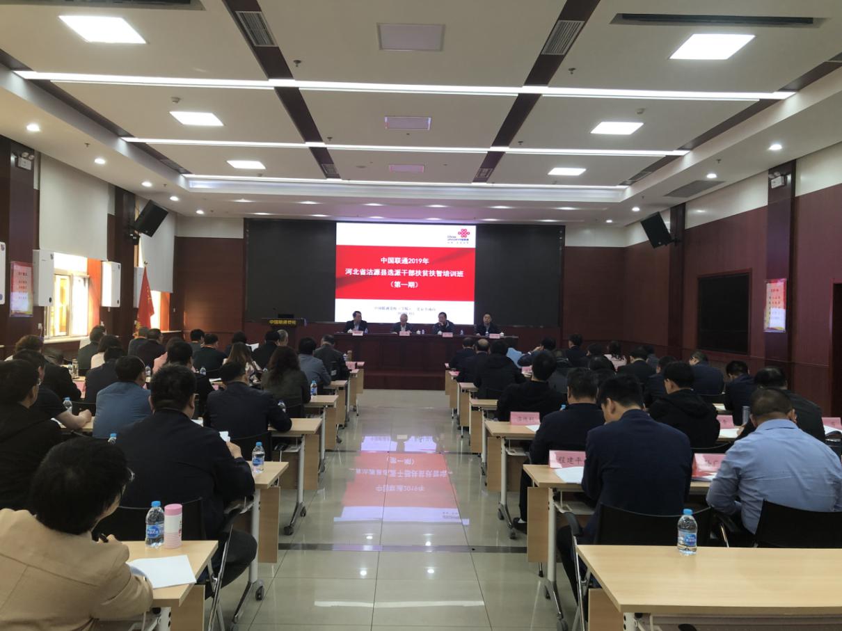 2019年4月21日中国联通河北省沽源县选派干部扶贫扶智培训班(第一期)在中国联通党校开班,中国联通集团公司党群工作部(扶贫办)副主任洪钟、中国联通党校副校长季巍、沽源县县委书记郭有和出席开班仪式