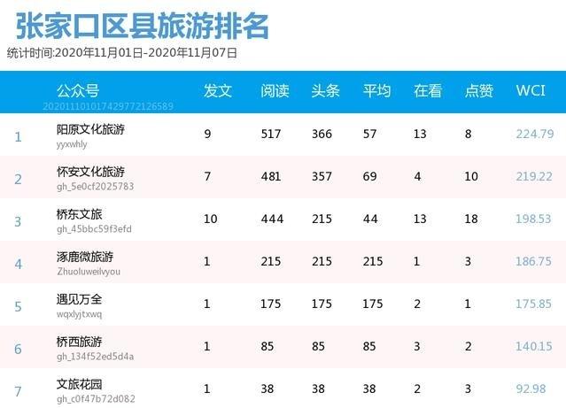 3、周榜|2020.11.01-2020.11.07张家口县区旅游微信影响力排行榜!