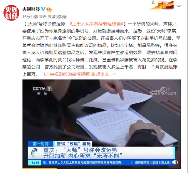 【“大师”号称会改运势,上千人买手机号转运被骗】一个所谓的大师,声称只要使用了她为你量身定制的手机号,好运就会接踵而来。据悉,这位“大师”李某,在重庆市开了一家名为“今飞扬”的公司。在被害人初步购买了定制手机号以后,李某就会哄骗他们继续购买声称能改运的物品,比如金字塔、能量吊坠等。