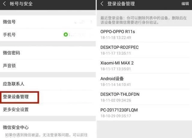 方法其实很简单,首先我们进入微信,打开我,然后点击设置,设置里面有一个“账号与安全”,再找到“登录设备管理”,在这里你就可以看到你的微信号在所有你曾经登录过的设备的记录,这些设备都是不需要再次进行验证就可以直接登录的。那么,我们把我们并不认识或者并不需要的设备全部进行删除,只留下我们常用的设备,那么被删除的设备就不能再直接登录我们的微信,微信安全就有了保障啦!